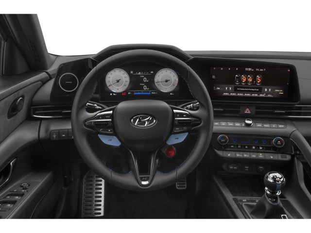 Handsome cloth-and-leatherette upholstery covers sport bucket seating. Behind the steering wheel, drivers enjoy a 10.25-inch digital cluster in place of gauges. An equivalent 10.25-inch touchscreen provides navigation and music. Finally, a high-tech N-specific steering wheel and shifter make this car sporty and one-of-a-kind.